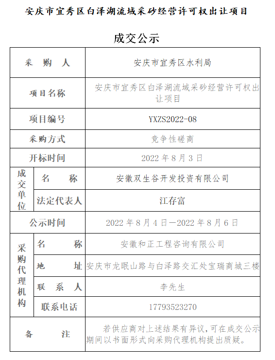 安慶市宜秀區(qū)白澤湖流域采砂經(jīng)營許可權(quán)出讓項目 成交公示