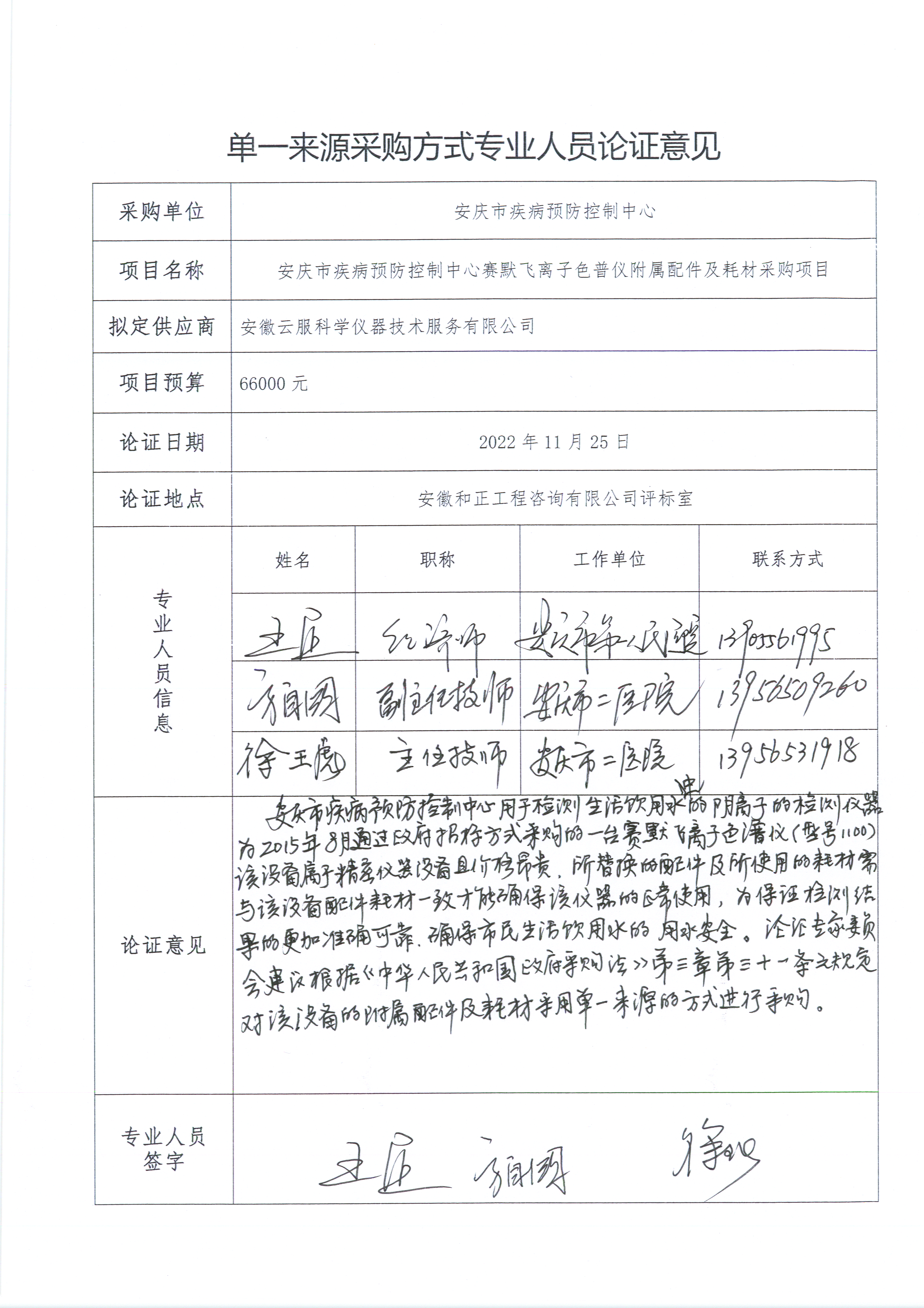 4.擬采購的貨物或服務(wù)的預(yù)算金額:66000.00元。 5.采用單一來源采購方式的原因及說明:理化科于2015年8月通過政府招標(biāo)方式采購了一臺賽默飛離子色譜儀(型號1100),總價55萬,用于檢測生活飲用水中的陰離子。本次采購項目為賽默飛離子色譜儀附屬配件及耗材,該設(shè)備屬于精密專用設(shè)備,所替換配件以及所使用的耗材,需與原設(shè)備配件耗材必須保持一致,才能確保正常使用,根據(jù)《中華人民共和國政府采購法》第三章第三十一條單一來源采購條件第一款“只能從唯一供應(yīng)商處采購的”規(guī)定,建議采用單一來源方式進行采購。需要購買賽默飛離子色譜儀(型號1100)附屬配件及耗材:ADRS 600 4mm陰離子抑制器AG204*50mm陰離子保護柱、AS204*250mm陰離子分析柱、KOH試劑罐,以能與中心原采購的型號1100賽默飛離子色譜儀匹配。故本項目擬采取單一來源方式采購,由安徽云服科學(xué)儀器技術(shù)服務(wù)有限公司提供本項目所需的相關(guān)貨物?! ?br />二、擬定供應(yīng)商信息