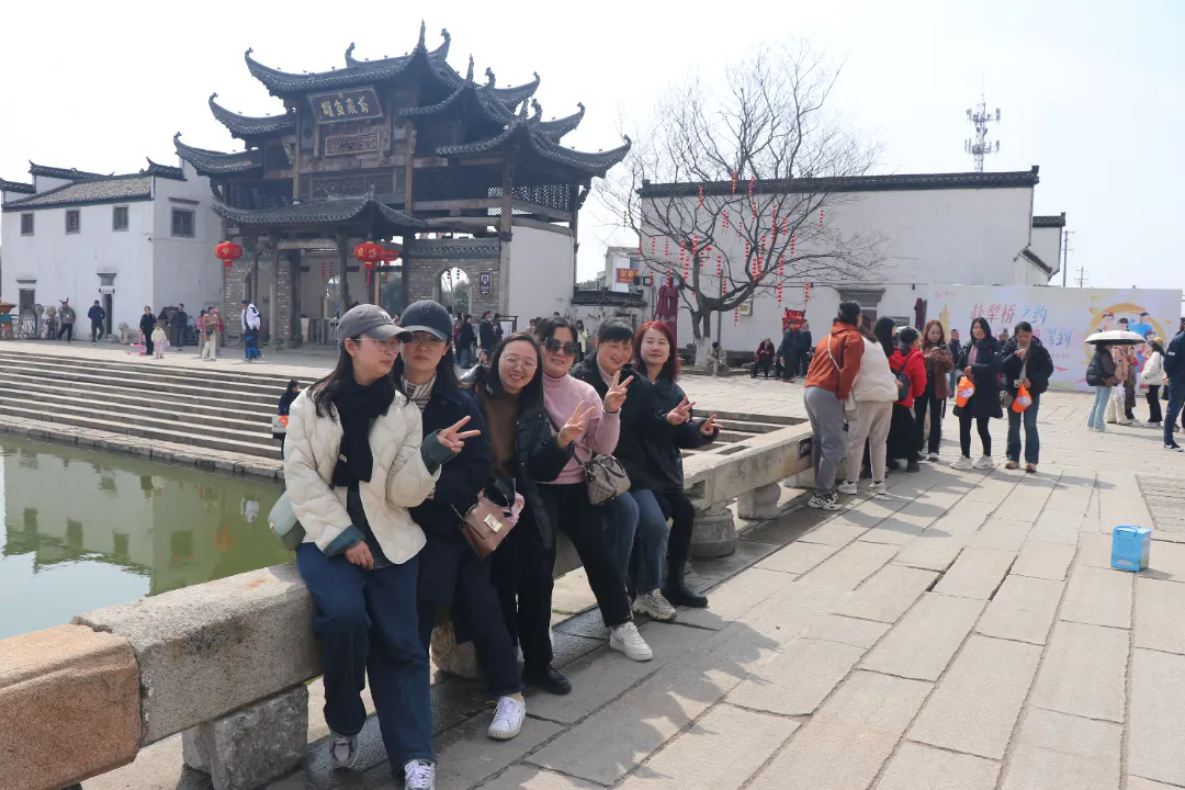 隨后,女神們乘車前往犁橋水鎮(zhèn),進(jìn)入古鎮(zhèn),映入眼簾的是成群徽派建筑,水面煙霧繚繞、煙雨朦朧,讓人以為誤入了仙境。女神們漫步于青石巷中或走上水鎮(zhèn)的橋頭,看游船往來穿梭、游人閑庭漫步,拿起手機(jī)按下快門,一幅鄉(xiāng)村里的“清明上河圖”收入囊中。